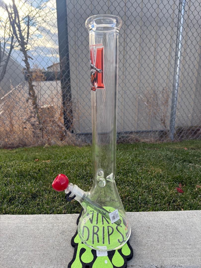 The AFM Glass 18" Beaker – Sports Edition celebrates team spirit with a bold, athletic twist. Standing 18 inches tall, this beaker features colorful baked-on logos inspired by three legendary cities and their iconic teams: Los Angeles (basketball), Chicago (basketball), and Kansas City (football).