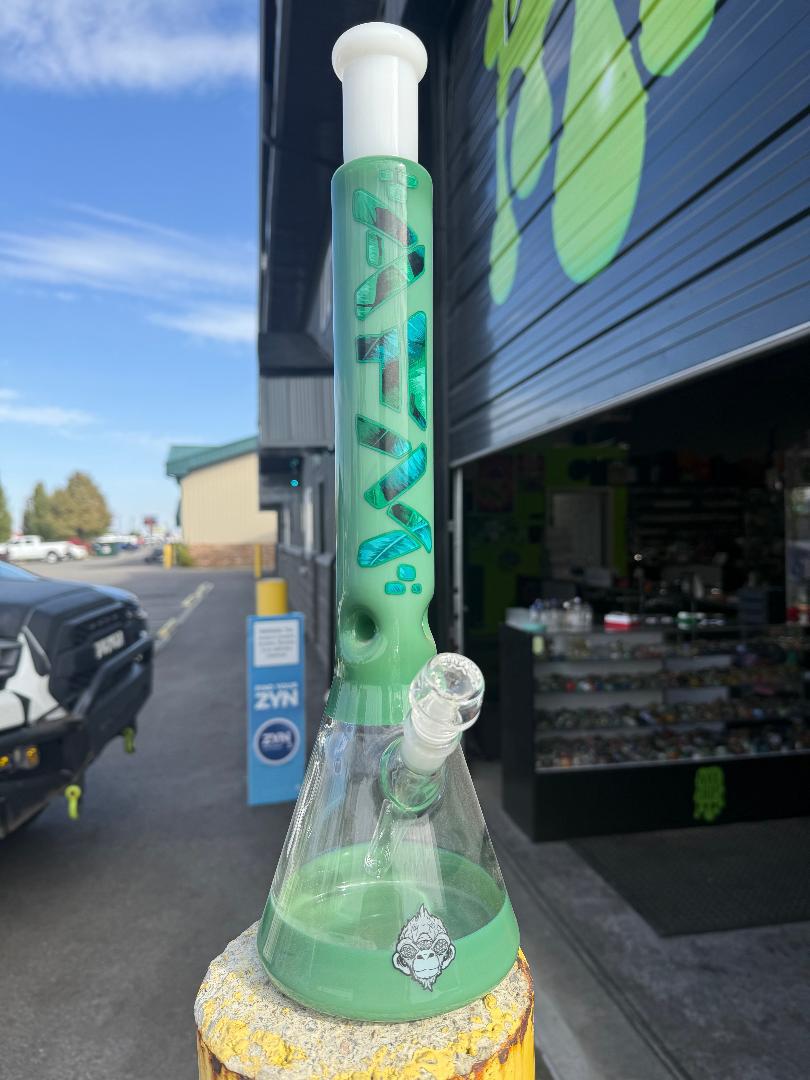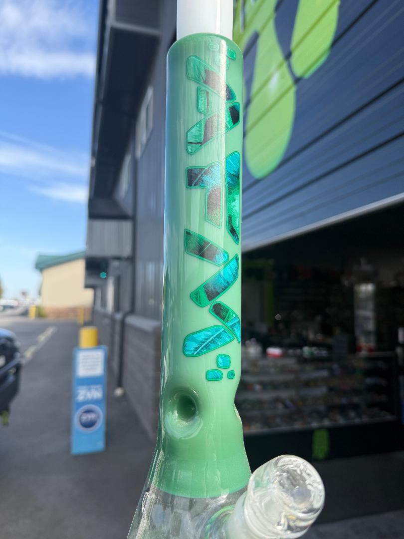 Made from durable borosilicate glass, the 18-inch beaker-style base offers enhanced stability and a larger water capacity for superior filtration and cooling. The green and white swirled design wraps beautifully around the piece, while the detailed leafy bake-on logo adds a signature touch of craftsmanship and authenticity.