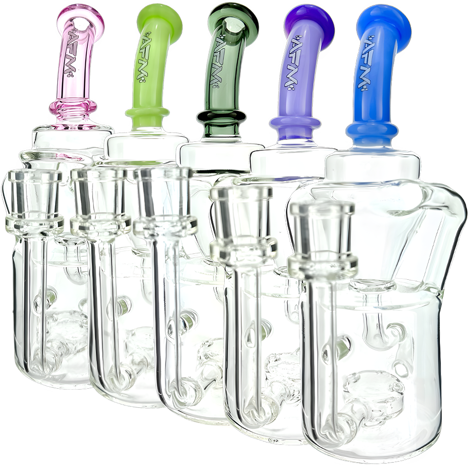 Built for performance and crafted with bold style, the AFM Glass 8" Mighty Can Color Recycler Dab Rig T520 delivers powerful function in a compact, eye-catching design. Featuring a durable can-style body with vibrant colored glass accents, this recycler rig offers excellent airflow and smooth, filtered hits through its continuous water recycling system.