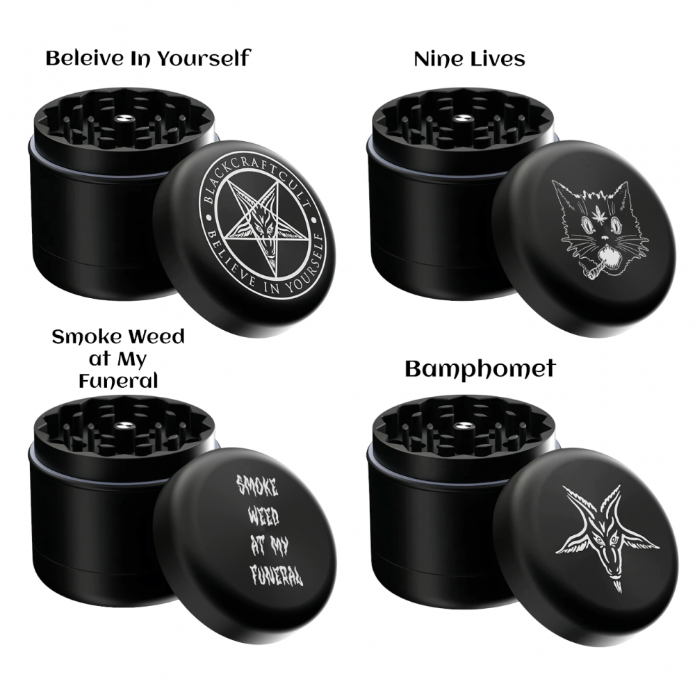 The Blackcraft 2″ 4‑Piece Grinder combines smooth grinding performance with bold, alternative design. Crafted from durable aluminum and made for everyday use, it’s available in four signature variants: Believe in Yourself, Nine Lives, Smoke W**d at My Funeral, and Baphomet.
