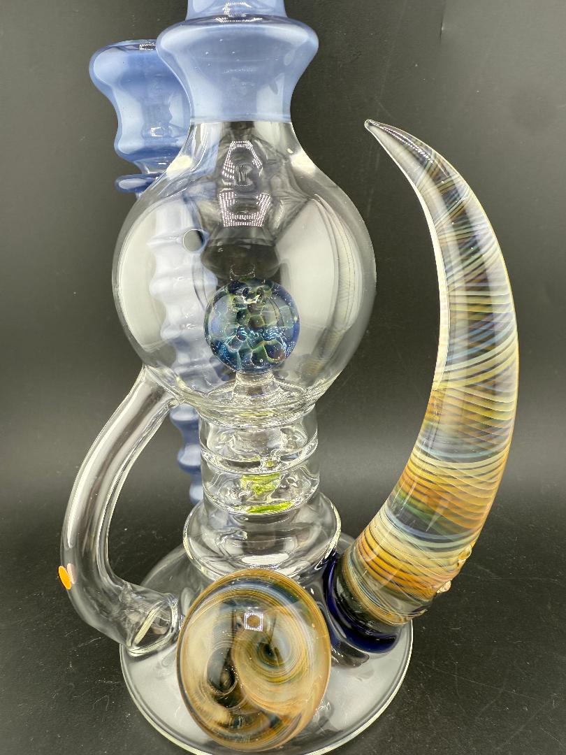 Handcrafted in Spokane, Washington, this 14mm 90° Blooper showcases a large format UV blue body accented with marble attachments and fumed horn details. Perfect for collectors or functional use, it combines artistry and performance in one striking piece.