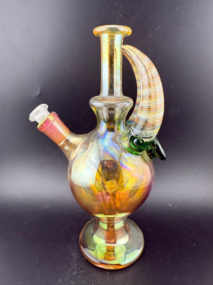 Hand-blown by Brando Glass, known for intricate fuming and creative designs
