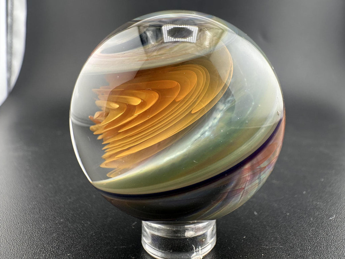 The implosion design pulls your eye deep into the marble, while the swirled backing creates contrast, color, and dimensional depth. Made from premium borosilicate glass, this large-format marble is a showpiece for serious collectors, art lovers, or anyone seeking a standout addition to their display.