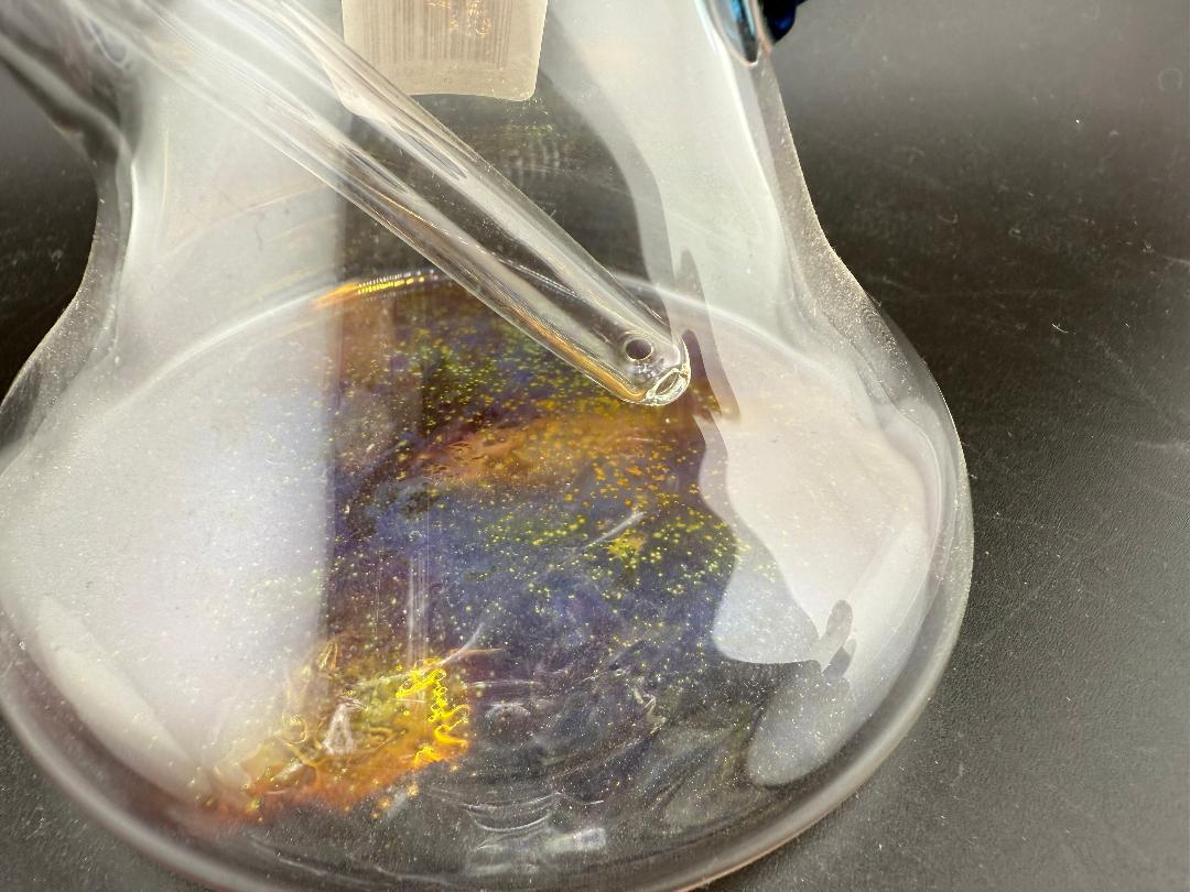 A compact little beaker with that unmistakable Brando flavor—soft fume work that shifts in the light, paired with a matching fumed horn to give it a touch of personality without overwhelming the form. Despite its size, it feels intentional and balanced, the kind of piece that disappears into your daily rotation because it’s so easy to reach for.