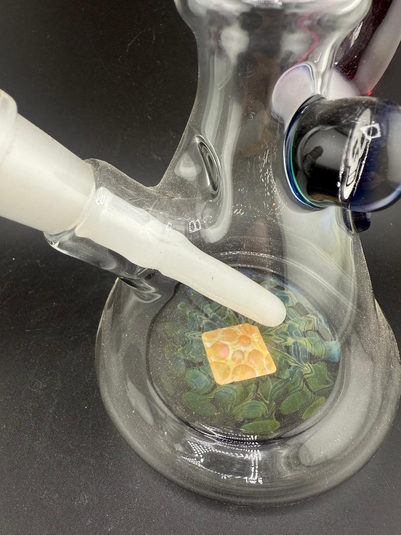 Add a touch of punk flair to your collection with the Brando Glass Mini Beaker, featuring a vibrant royal jelly fumed horn, a Misfits skull millie, and a crisp white down stem. This 10mm 45° rig combines collectible artistry with practical functionality.