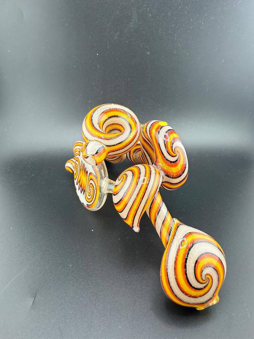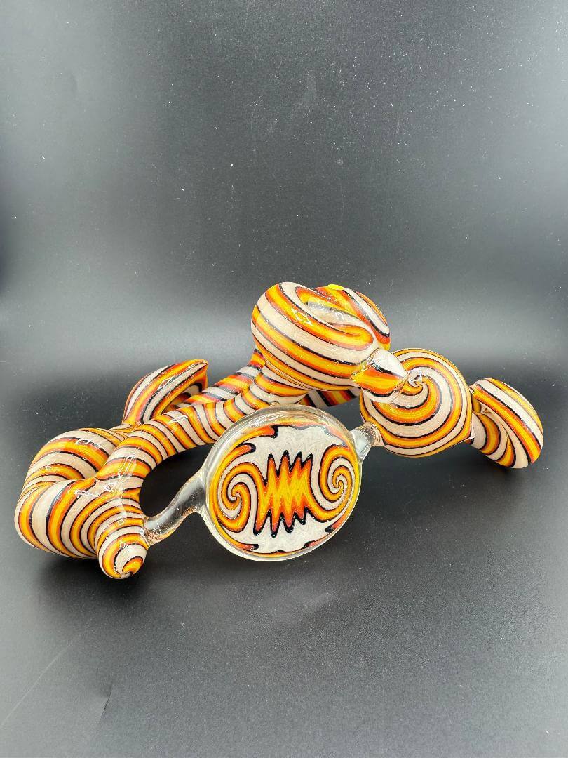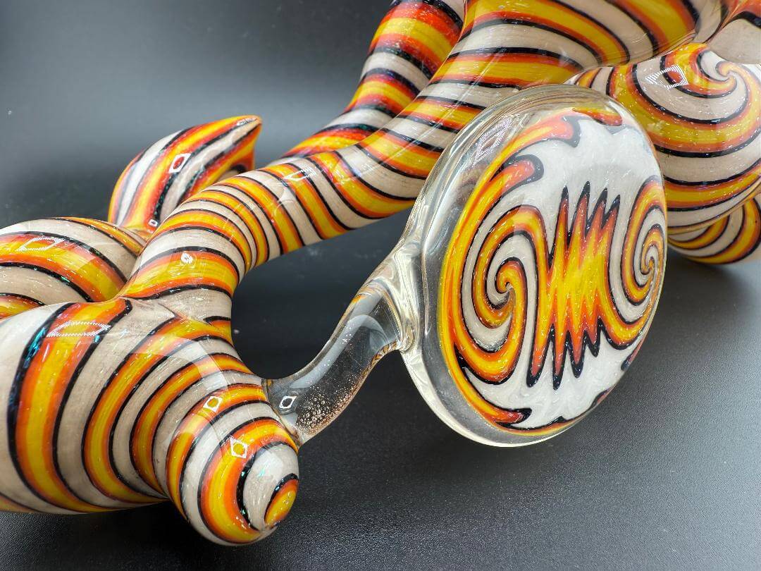Currently on display at Nikk Drips in Post Falls, Idaho, the Crondo Glass UV White Orange Dichroic Dry Pipe is a must-see for those who love vibrant, one-of-a-kind pieces.