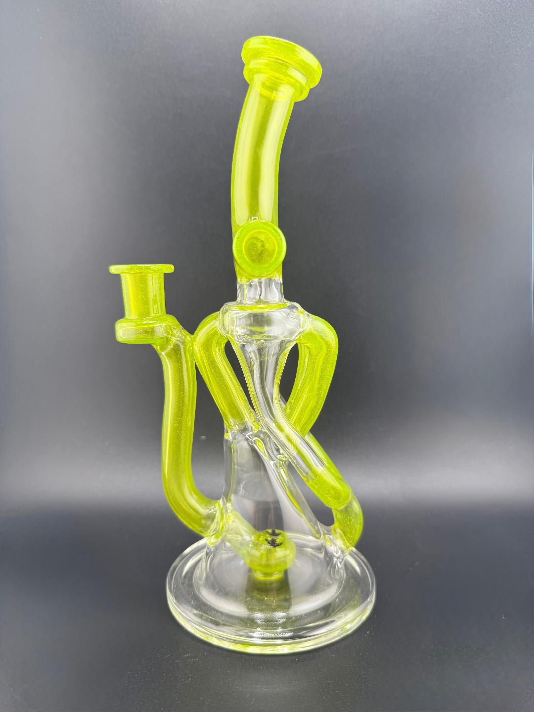 SEO Keywords: Domer Glass recycler, green double recycler rig, 10mm 90 degree dab rig, American made recycler, functional glass art, heady recycler Post Falls, Nikk Drips glass shop, recycler dab rig, smooth hitting dab rig, local glass Spokane area