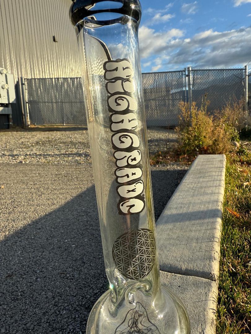 This Highgrade Glass Flower Beaker showcases a stunning wig wag reversal motif in blue, black, and white across the bottom, matching downstem, and included bowl. Expertly crafted for both visual appeal and smooth function, it's a standout piece for any collection.