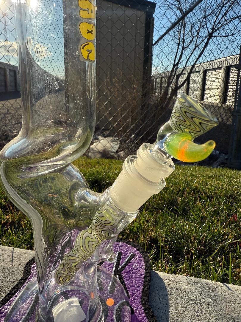 This Highgrade Glass Flower Straight Tube features green and white Wig Wag color accents with a pistol loop design for easy handling. Perfectly balancing style and function, it’s an eye-catching piece for any collection or session.