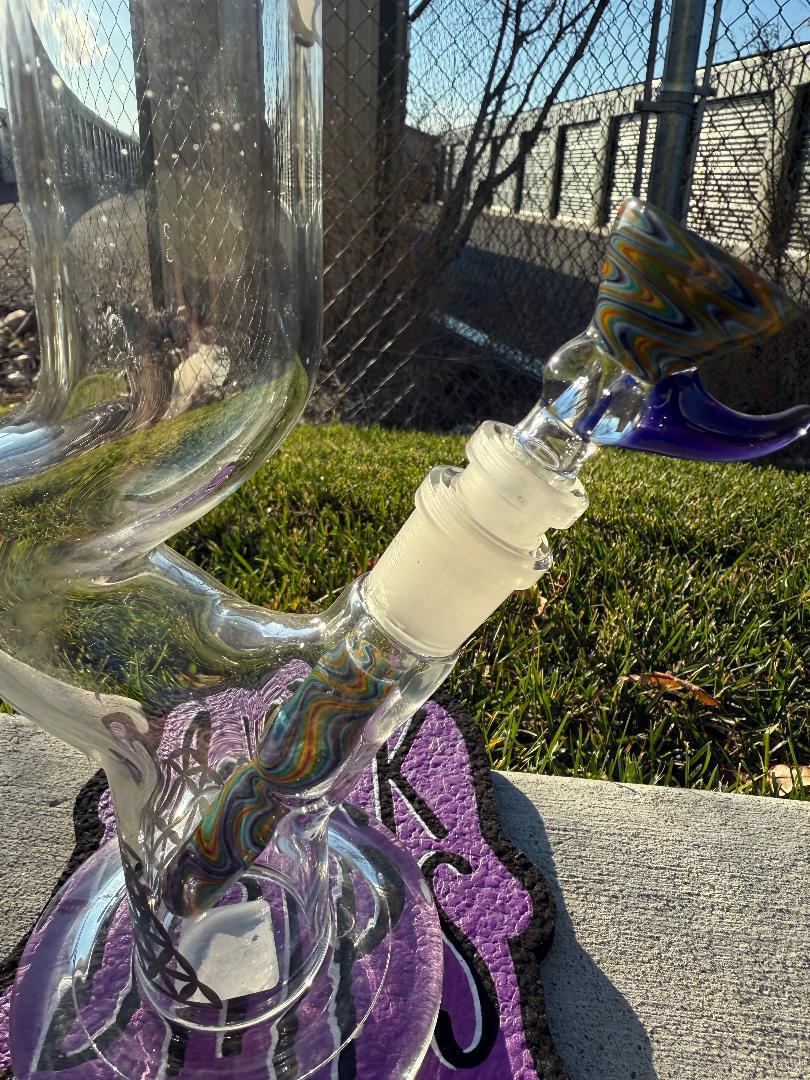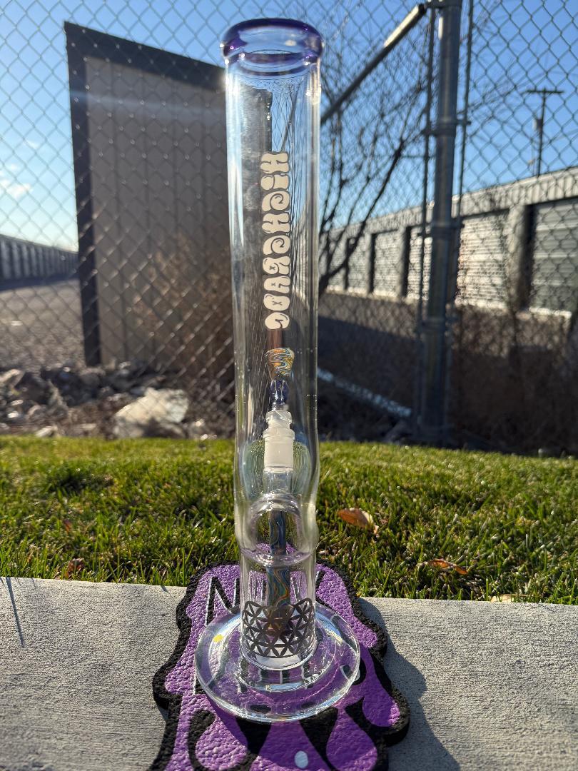 This Highgrade Glass Flower Straight Tube features a stunning Rainbow & Blue Wig Wag color accent with a pistol loop design for easy handling. Crafted for both aesthetics and functionality, it’s a versatile piece for any collection or session.