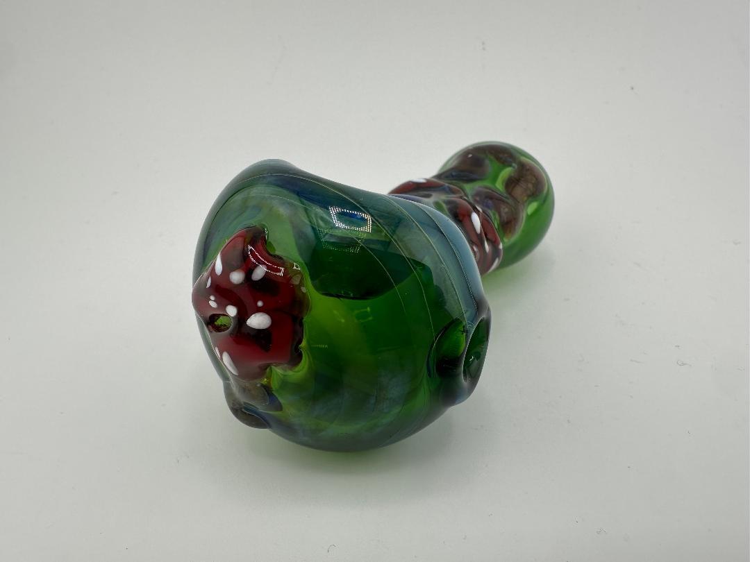 The Mop Head Glass Full Color Mushroom Dry Pipe features whimsical artisan glasswork inspired by mushroom motifs. The full color design integrates vibrant glasswork throughout the piece, creating rich visual depth and a playful collectible aesthetic.