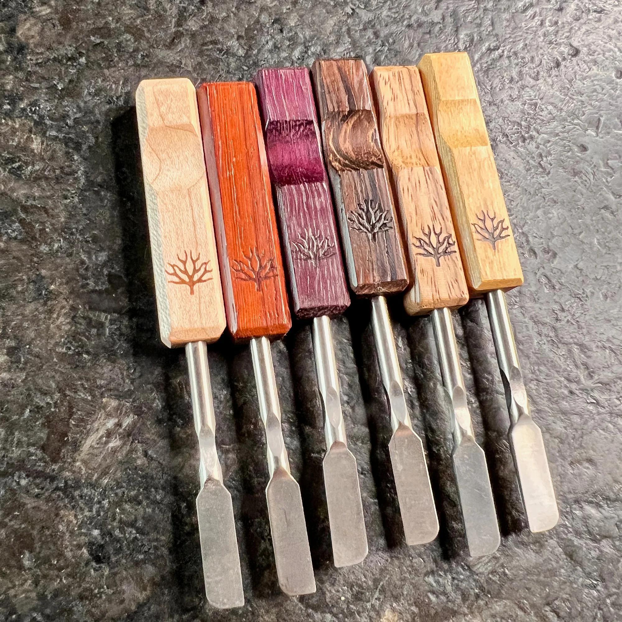 The Mystic Timber Pocket Blade Dab Tool is a sleek, portable concentrate tool designed for precision and ease of use. Featuring a G2 titanium blade tip paired with a premium hardwood handle, this pocket-sized dabber is perfect for scooping, scraping, and handling concentrates with accuracy. Each tool highlights the natural beauty of the wood, ensuring every piece is truly unique.