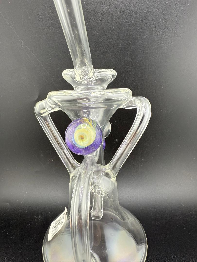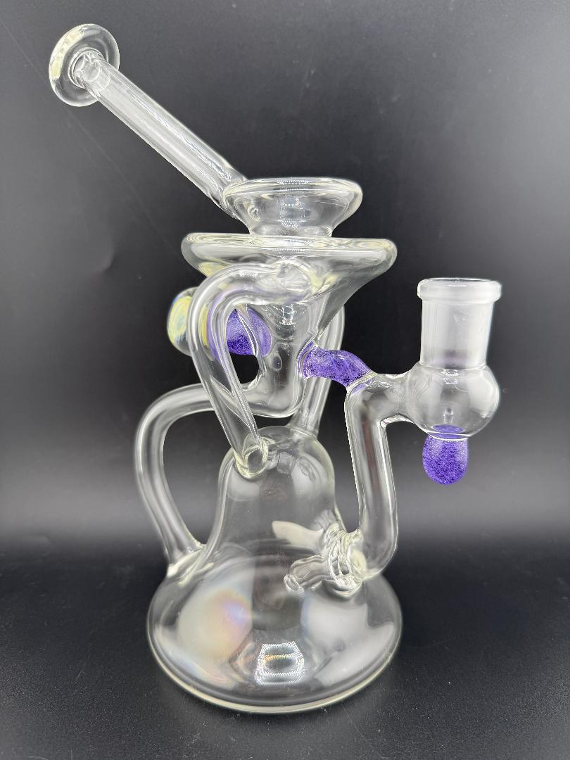 The Pugsley Glass Clear Recycler delivers smooth, clean hits with advanced filtration in a compact and durable design. Featuring a 14mm 90° joint, this recycler enhances diffusion by continuously cycling the water, providing cooler, cleaner pulls with every session. Available with either orange or purple accents, this piece adds a vibrant touch to its clear glass construction, highlighting the intricate recycler design.