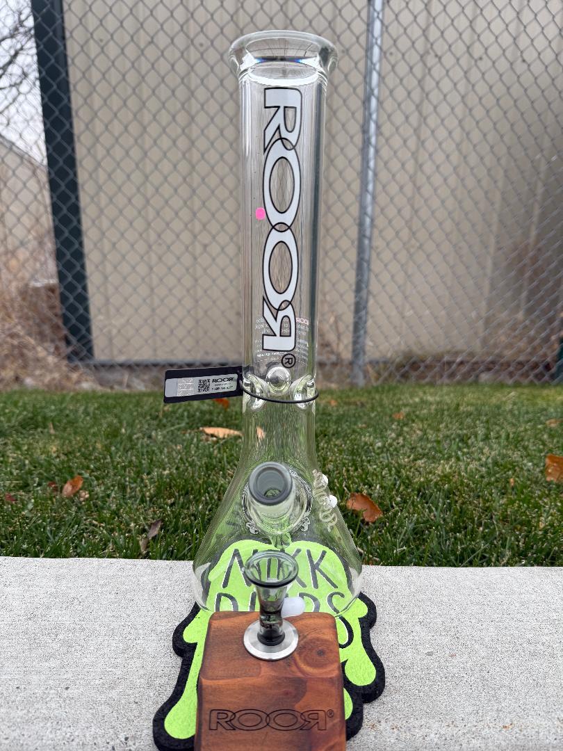 The ROOR Glass 14" Beaker Collector Series delivers exceptional craftsmanship, combining performance and style. Made from premium German borosilicate glass, this 50x5mm thick beaker features a sleek grey finish, a color-matching bowl, and a wooden display stand, making it a standout piece for collectors and enthusiasts alike.