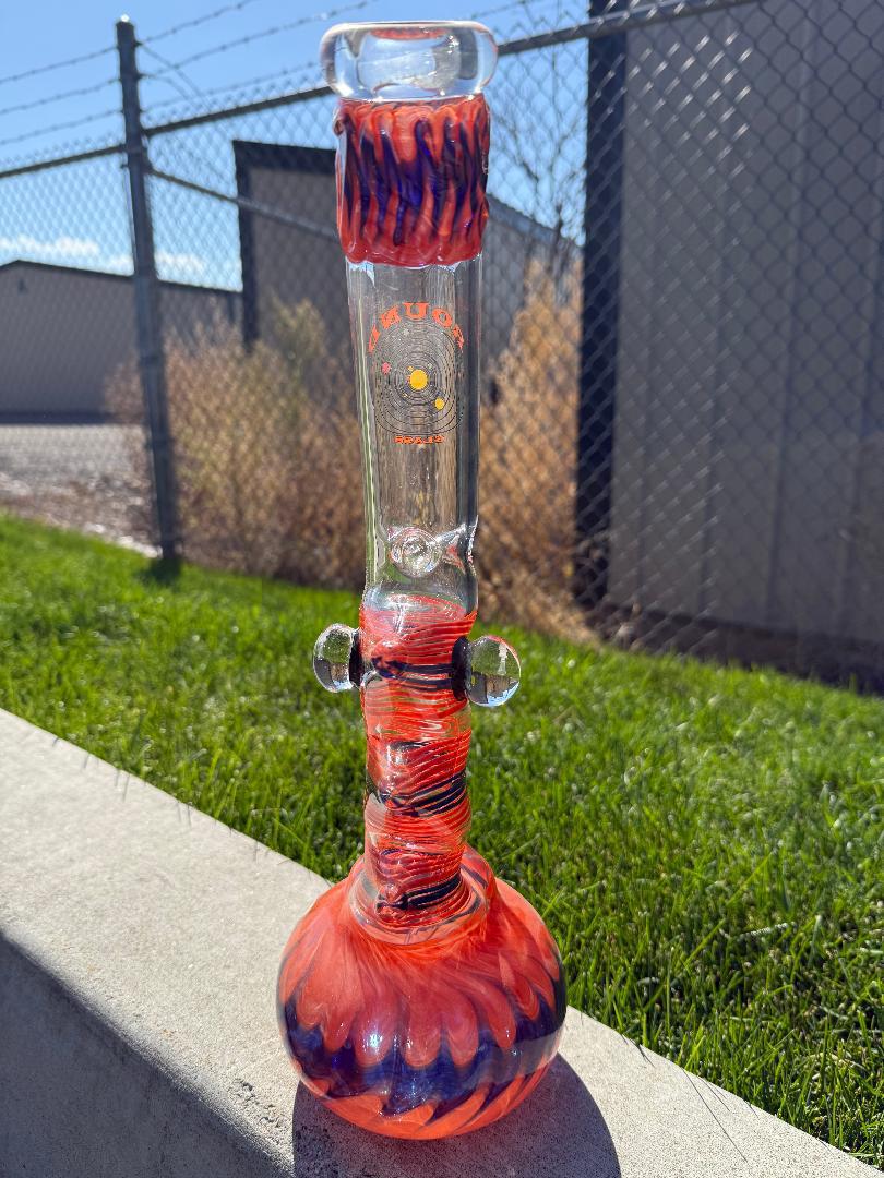 Add a burst of color and style to your collection with the Round Glass Orange and Blue Spiked Bubble Beaker. Featuring a bold, textured spiked bubble design in bright orange and blue hues, this beaker rig is crafted from durable borosilicate glass to ensure long-lasting use and superior water filtration. Its 14mm female 45° joint fits most standard bowls and bangers for versatile compatibility.