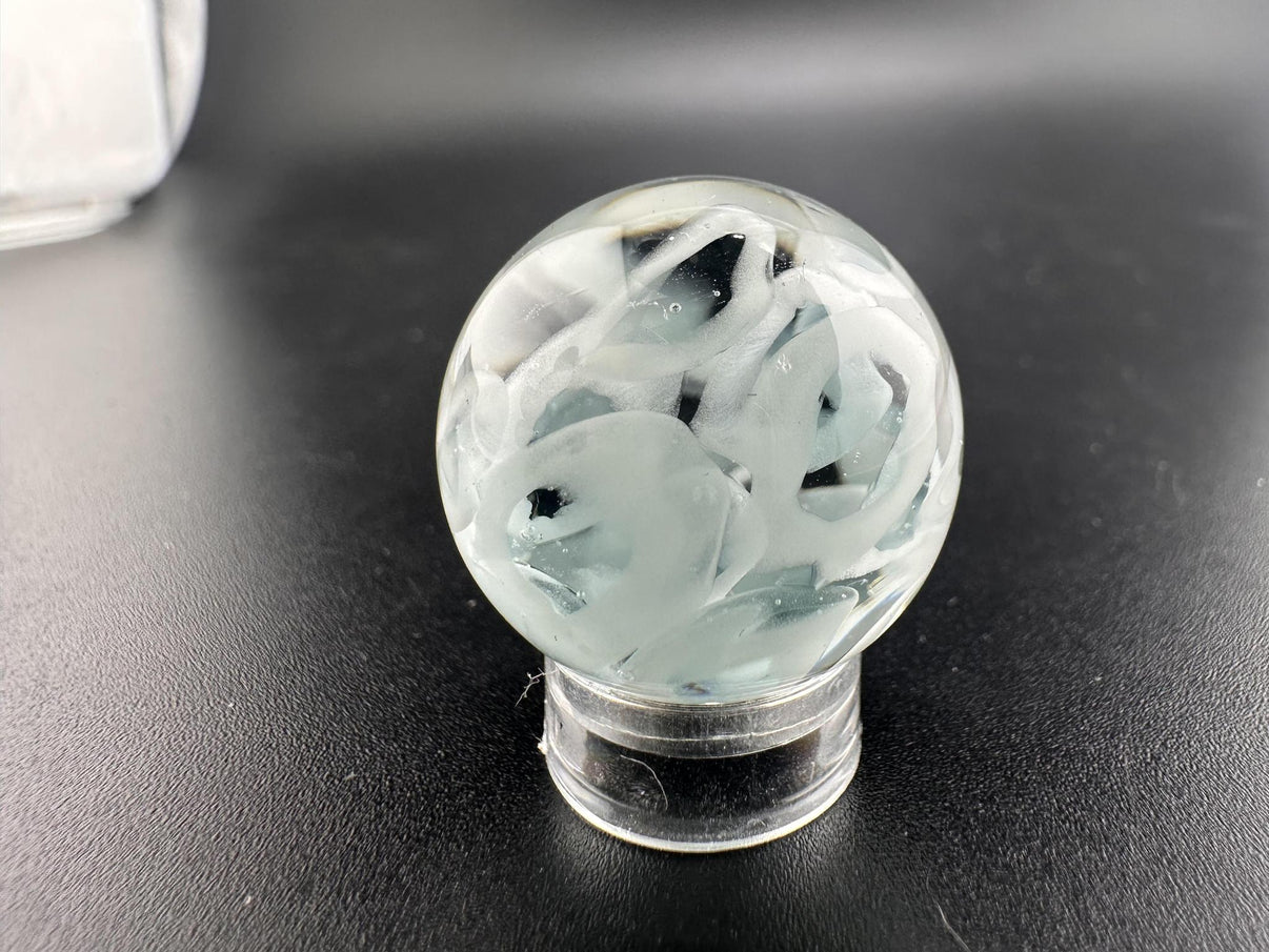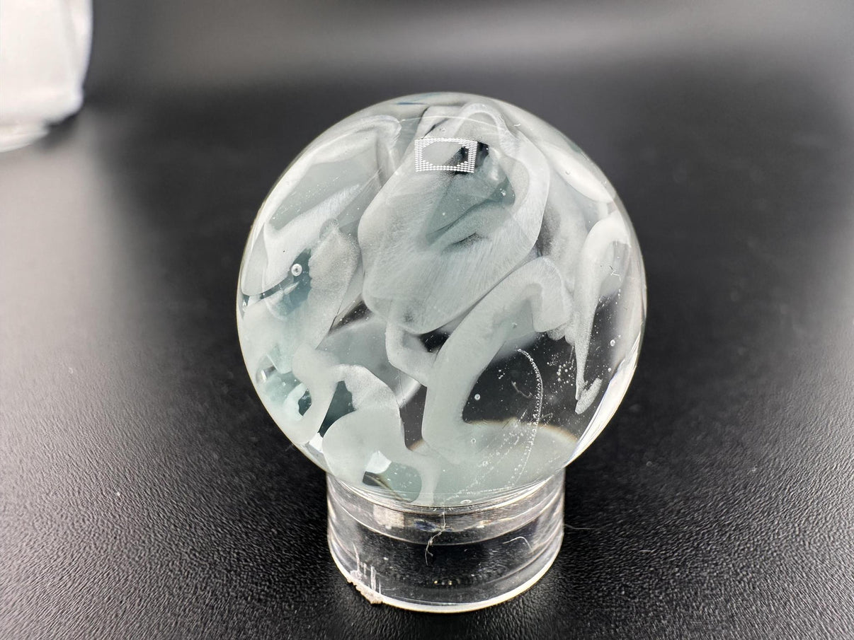 Discover understated beauty with the SBJ Glass Marble – Simple White Wisp, a handcrafted glass marble approximately 1 inch in diameter. Featuring delicate white wisps gracefully suspended within clear borosilicate glass, this piece highlights the subtle artistry and refined technique of SBJ Glass.