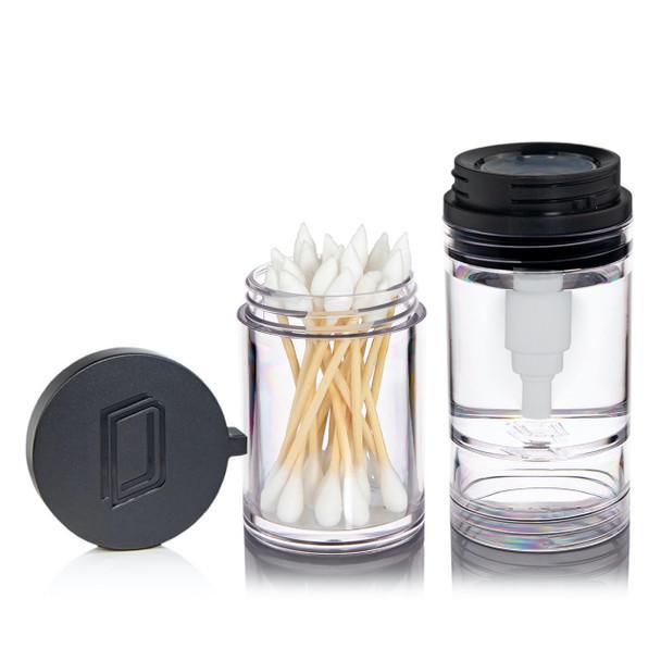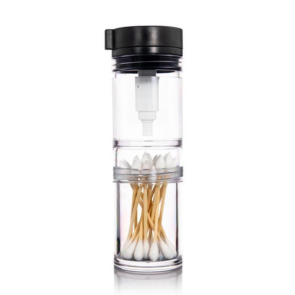 The Clean Can is a stackable iso station containing an isopropyl alcohol pump dispenser at the top and a cotton swab storage container at the bottom. This cleaning accessory is the perfect travel companion since it keeps all your cleaning needs in one compact space saving container.