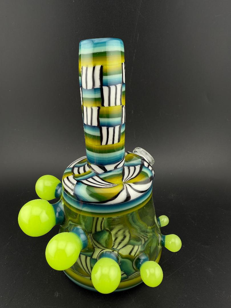 Step up your glass game with the Twisted Images Glass Chip Stack Jammer Rig, a visually striking and expertly crafted piece that blends art and function flawlessly. Featuring a captivating green colorway accentuated by the signature black and white chip stack pattern, this rig is as eye-catching as it is smooth. Designed with a 14mm female 45° joint, it offers seamless compatibility with standard 14mm male accessories.
